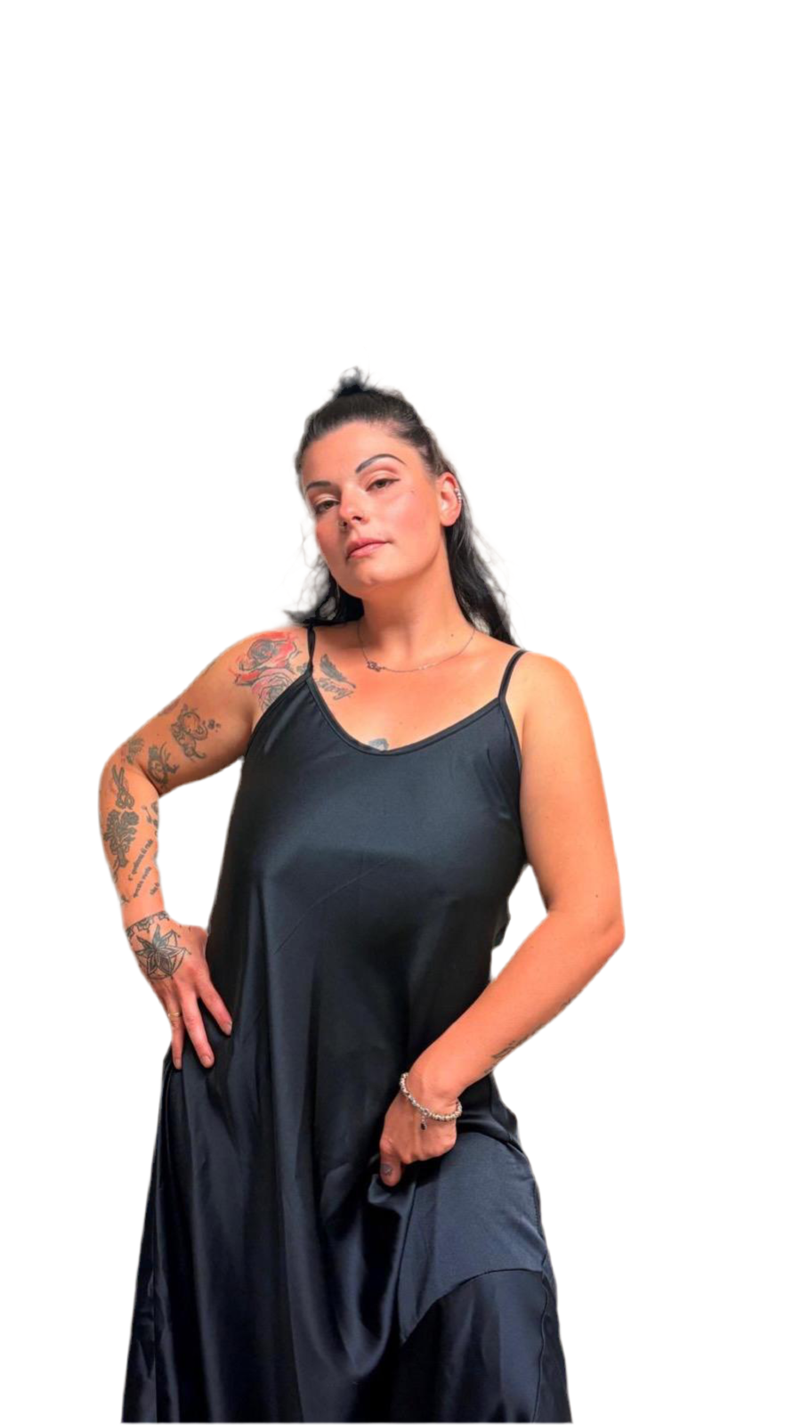 Abito in viscosa e seta ampio con cuciture pronunciate nel laterale.