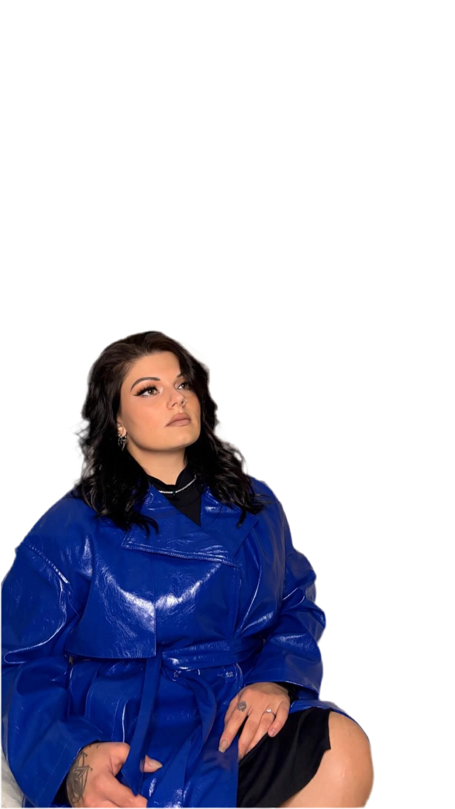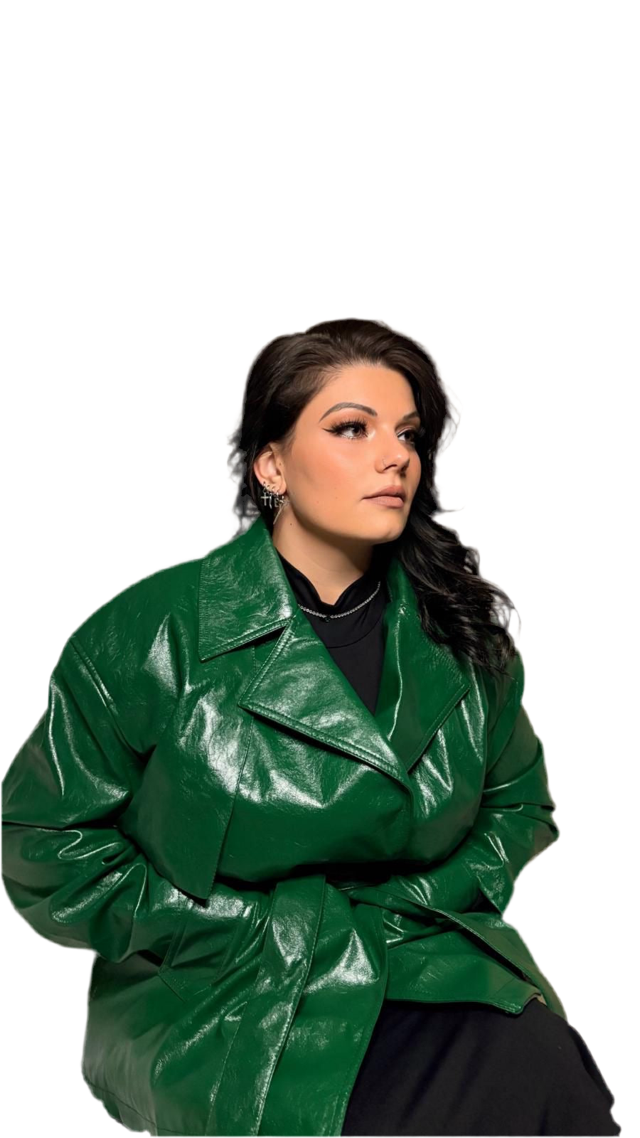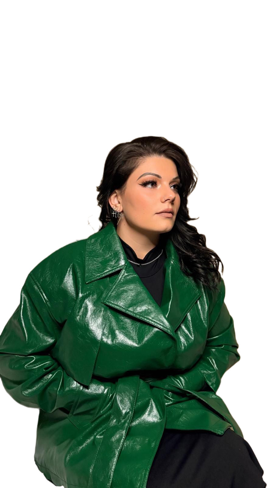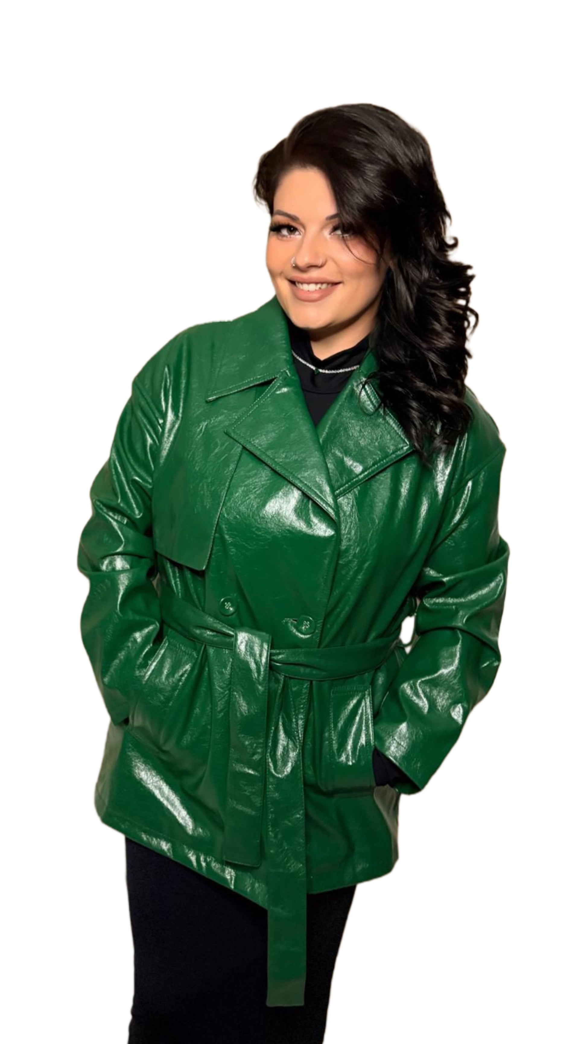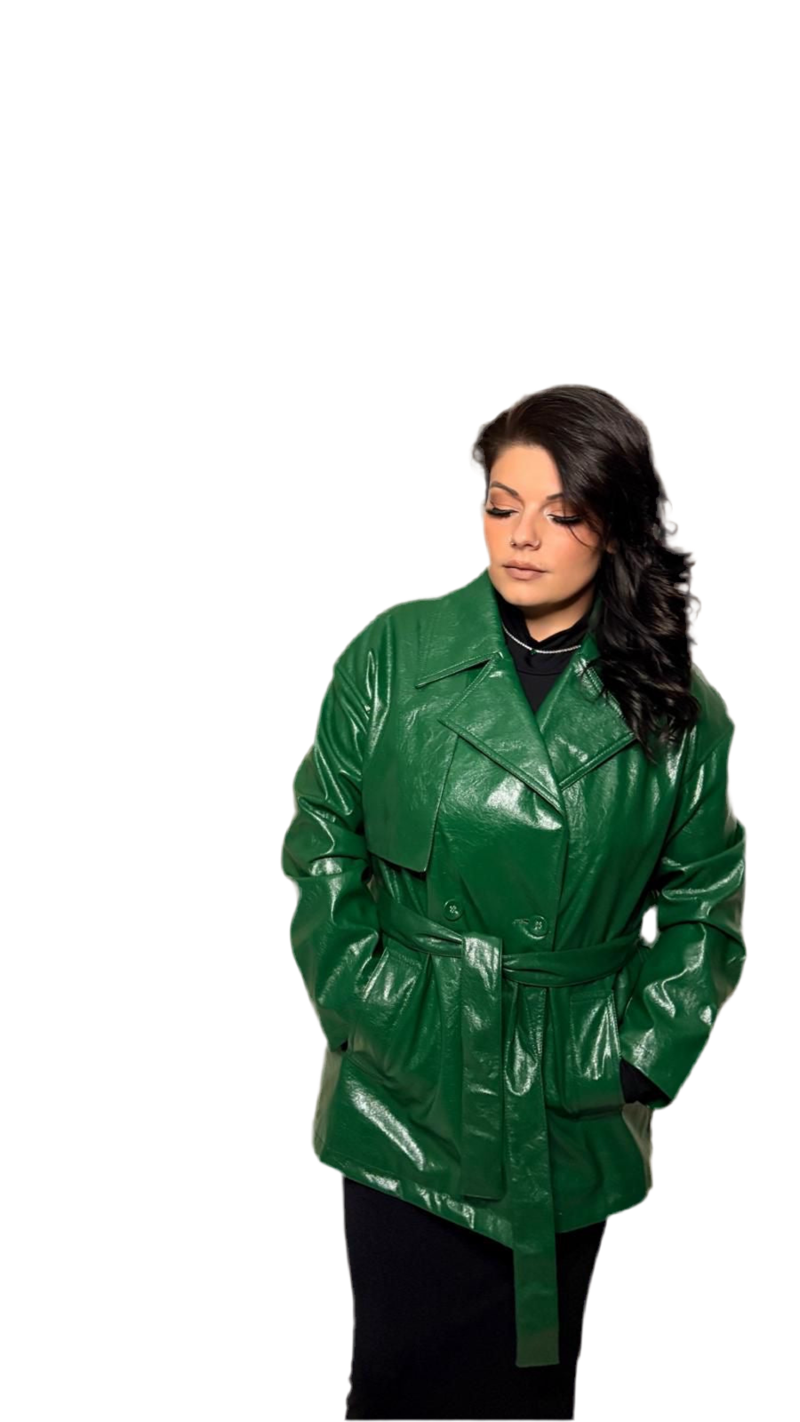 Trench in vinile in due varianti di colore verde e blu elettrico ; porta con sé una chiusura con nastro nel davanti più bottoni per chiusura semi-laterale